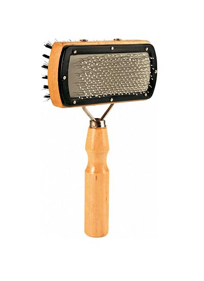 - Ξύλινη βούρτσα 2 όψεων με συνθετική τρίχα για μασάζ και λείανση του άνω/επιφανειακού τριχώματος και συρμάτινες τρίχες για φροντίδα του τριχώματος επιφάνειας και βάσης μαζί.